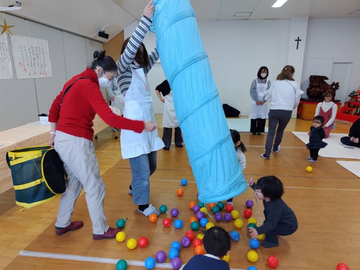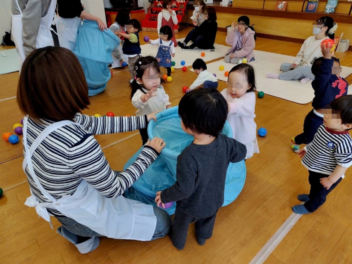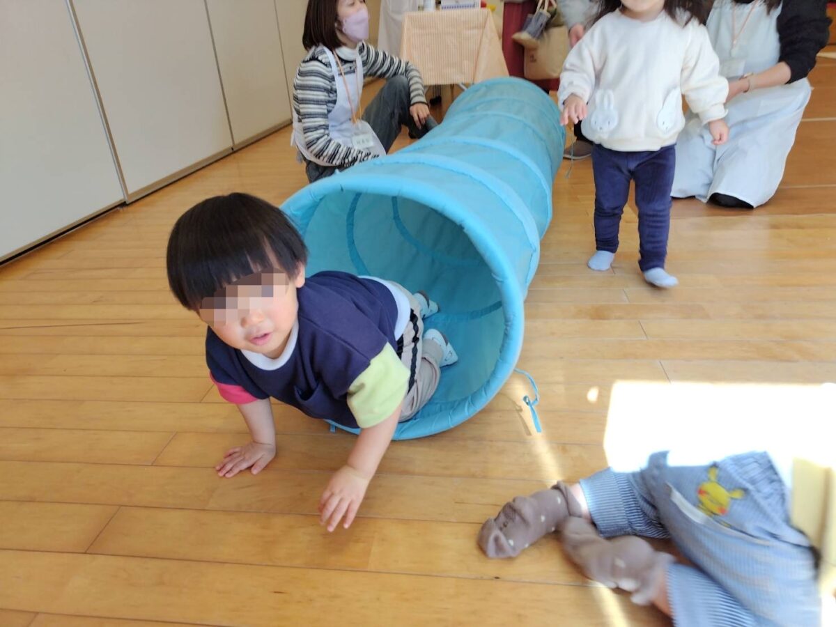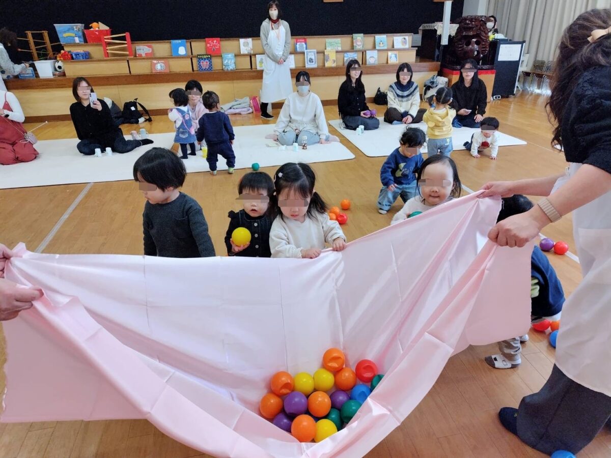 おやつの後はボールや布、トンネルを使ったお遊びタイム♪最後には“あおむしさん”が登場!皆で♪キャベツの中から~のお歌を楽しみました。