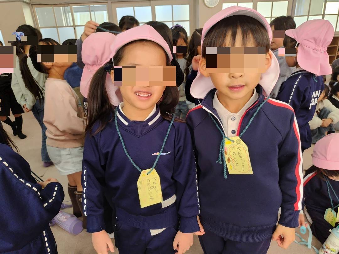 1年生からお守りを1つずついただき、クラスにも大きなお守りをいただきました。みんなからは大きなお手紙のプレゼントをわたし、小学校から帰ってきました。4月から1年生になる年長さんにとってとても良い経験をさせていただきました。南五葉小学校の1年生の皆さん、ありがとうございました(*^_^*)