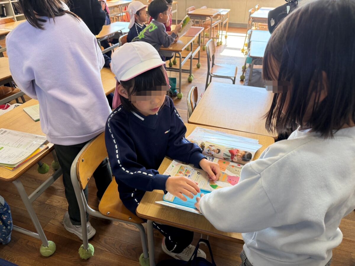 お隣の南五葉小学校の1年生からご招待いただき、小学生体験をさせていただきました。ミカエル卒園児のお兄さんお姉さんもおり、1年経つとたくましく更に磨きがかかって小学生になっており、年長さんを優しくエスコートしてくれていました。校舎内の案内や、ランドセルやお道具箱、算数セットなど説明をしてくれたり、実際に学校のイスに座り1人1人の机をつかわせていただき、国語の本を読んでくれたり、みんな興味津々で真剣に1年生の話を聞いていました。