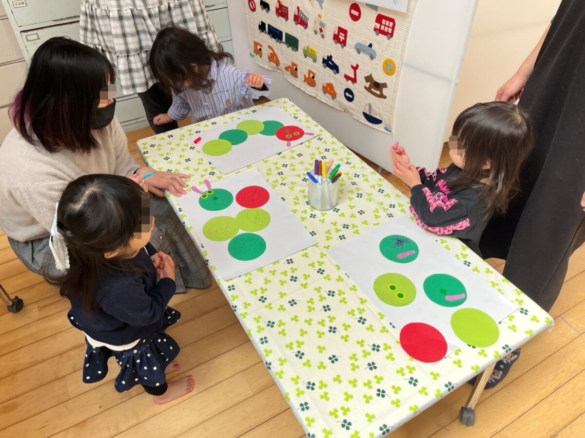 次に「はらぺこあおむし」の絵本を読んでから、あおむしくん製作♪個性豊かな、かわいいあおむしくんたちが完成しました♪