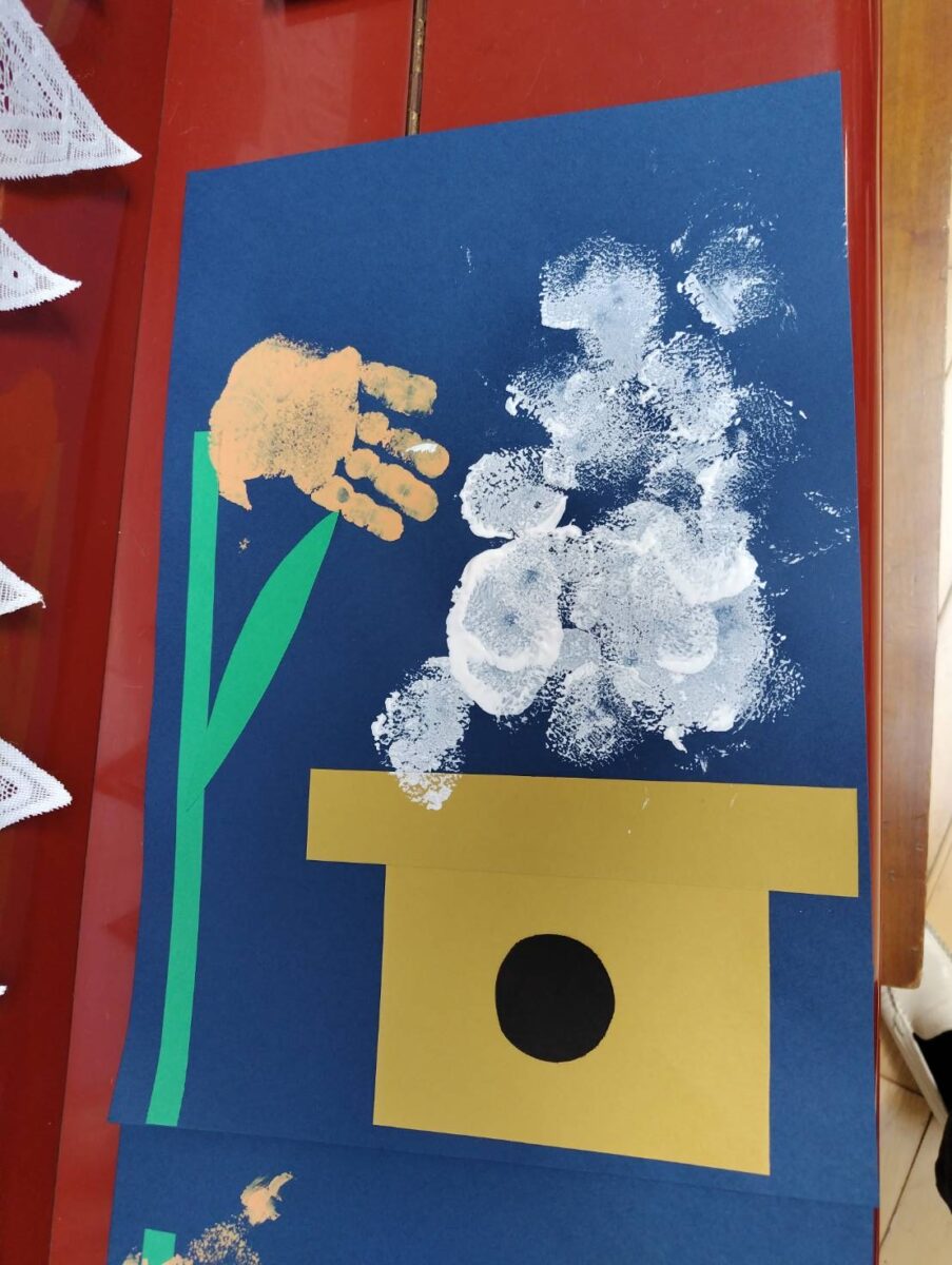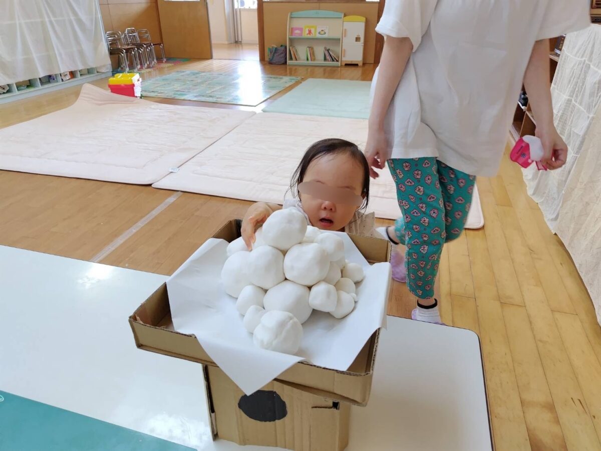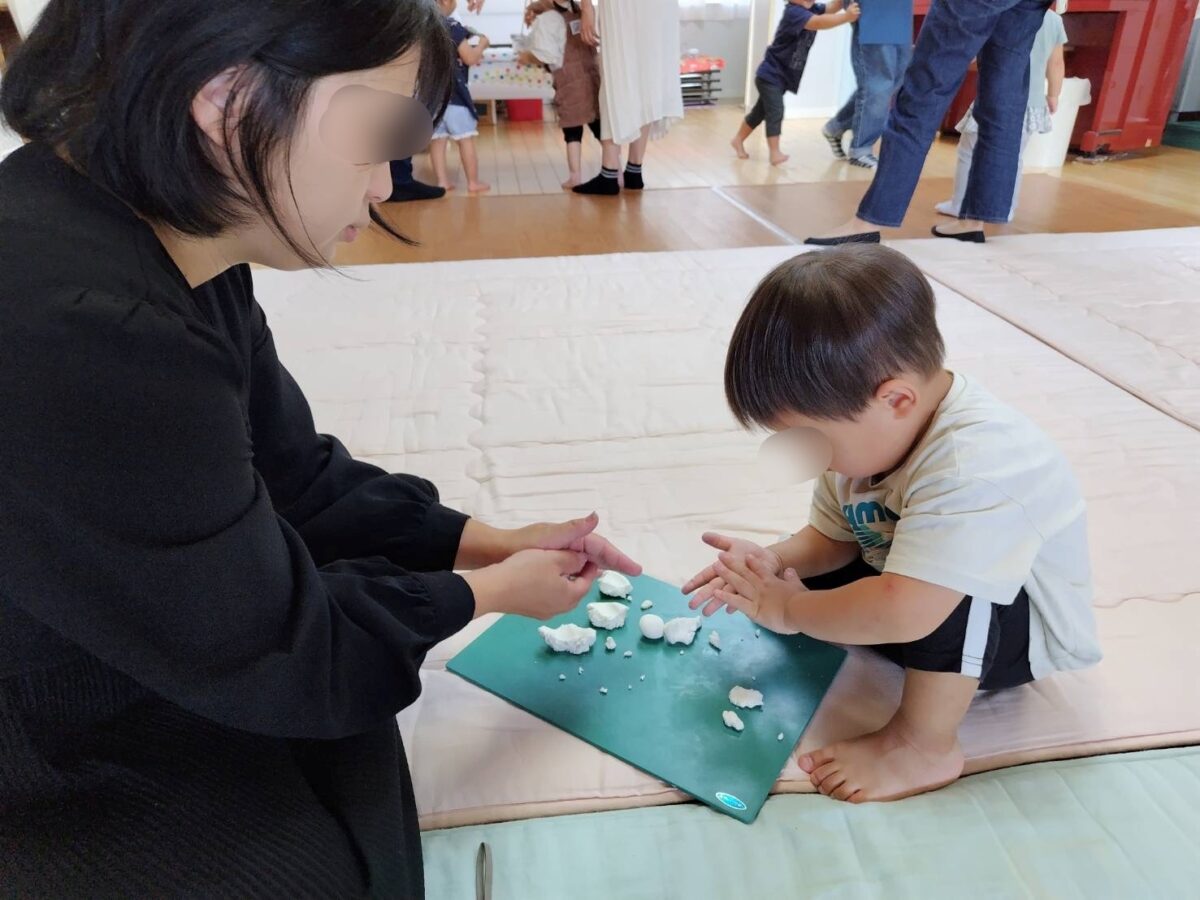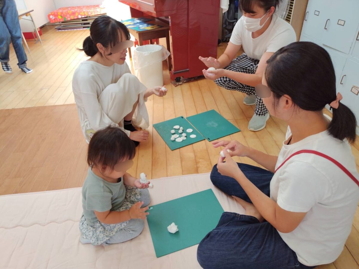 本日の親子登園日では、10月6日の“中秋の名月”に向けてお月見製作をしました。手形でススキができたり、スタンプでお団子を作ったり…とっても素敵な作品ができました♪またカラフルなスカーフで遊んだり、また“米粉粘土”で感触あそびを楽しんだ後、最後はお月見団子をみんなで作り、大きな月見団子が完成しました♪