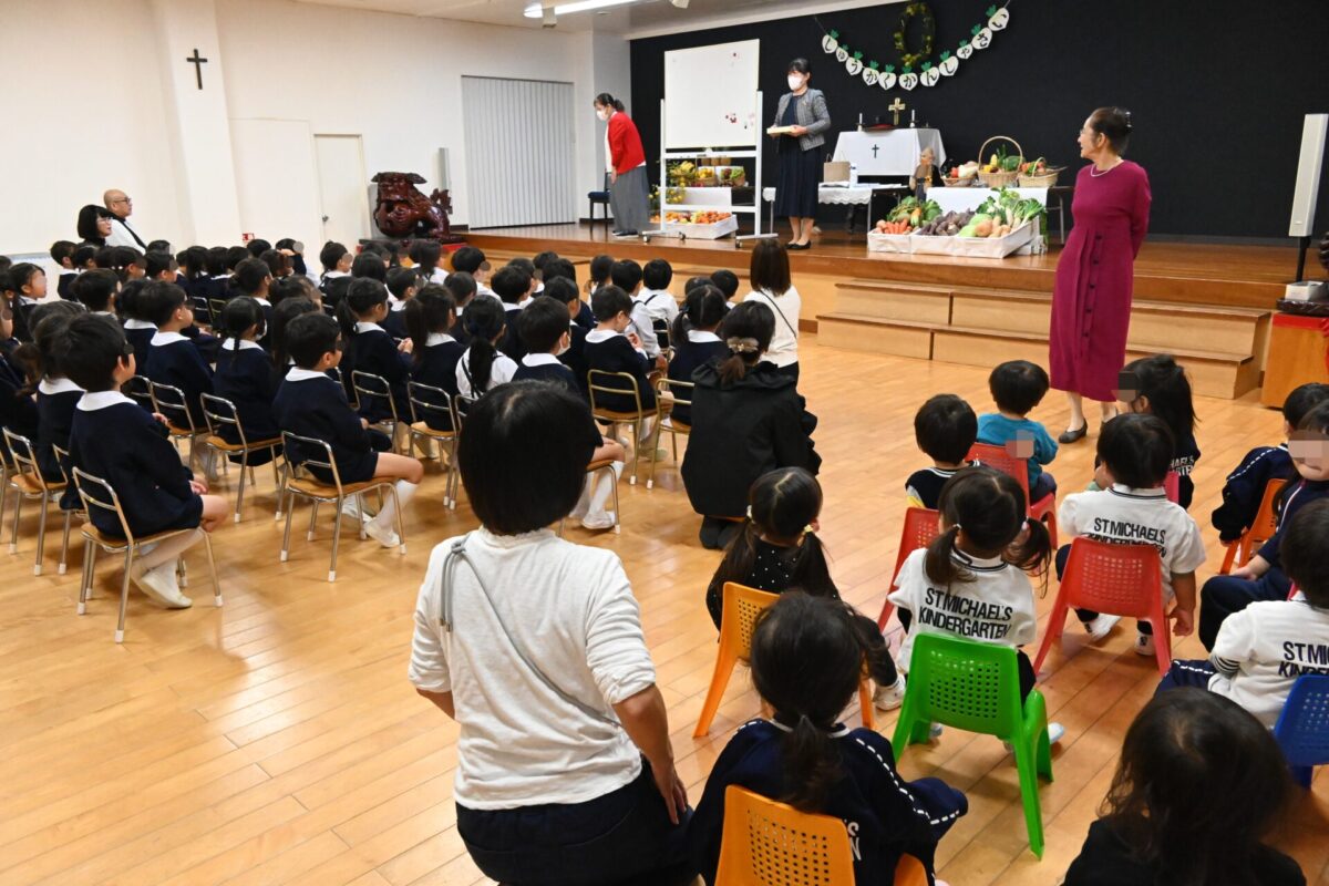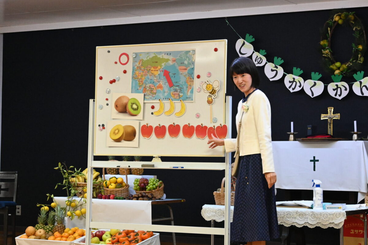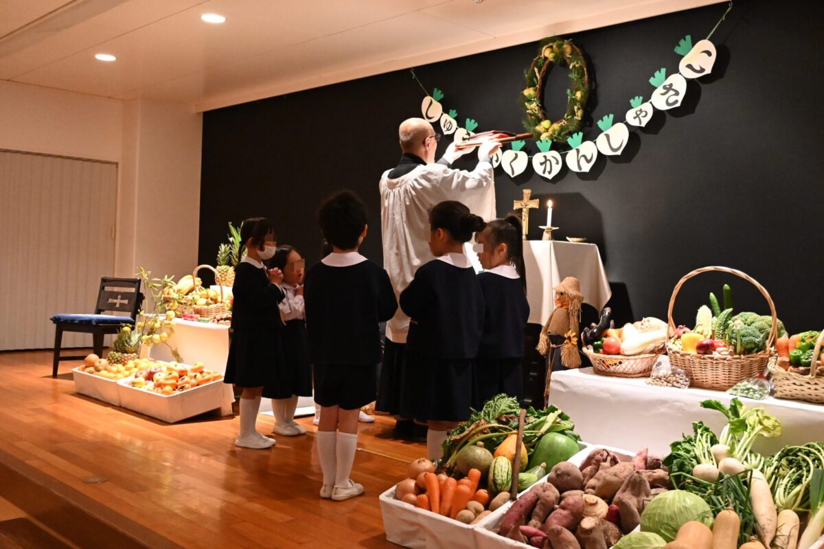 聖ミカエル教会の瀬山 会治司祭様にお越しいただき、迎えた本日の収穫感謝礼拝。みんなのお家から持ってきて頂いた野菜や果物を祭壇にお飾りし、秋の実りに感謝して祈りの時をもつことができました。