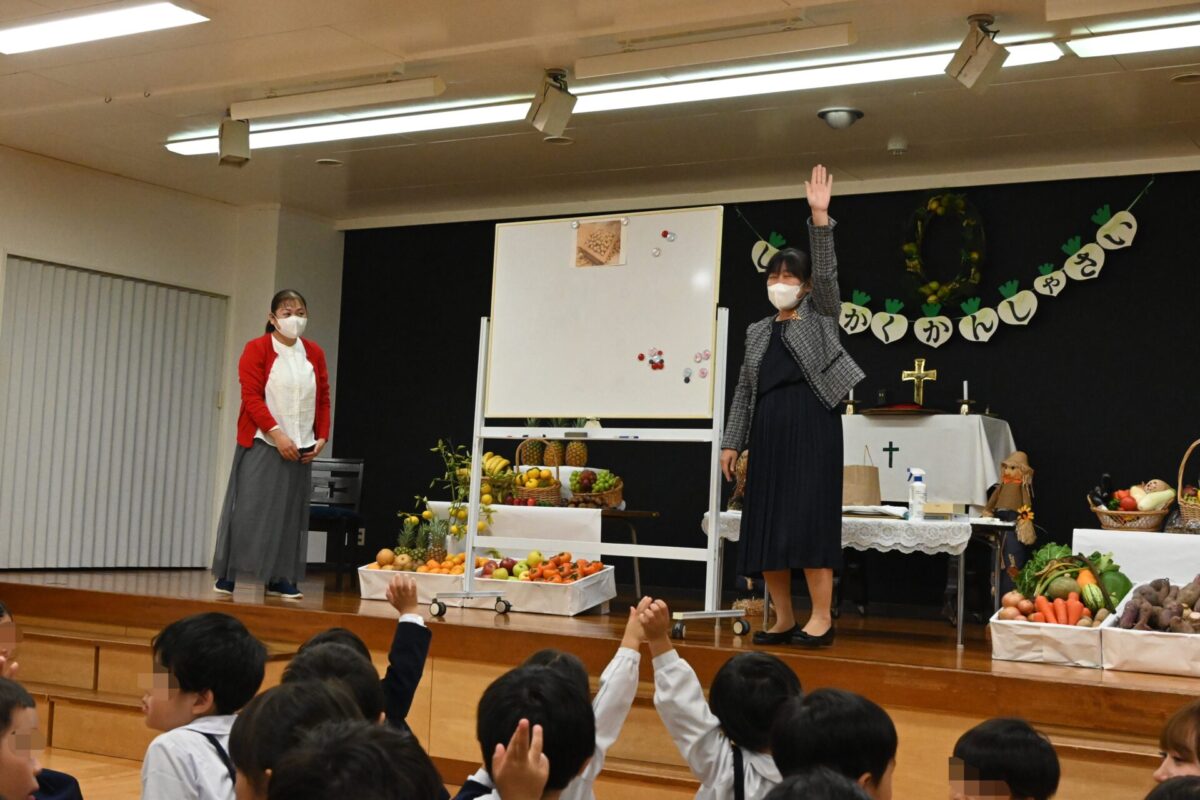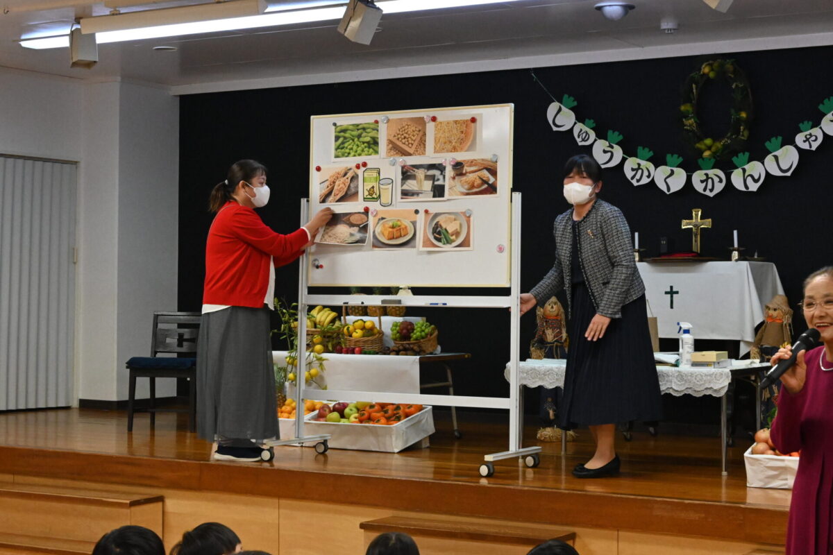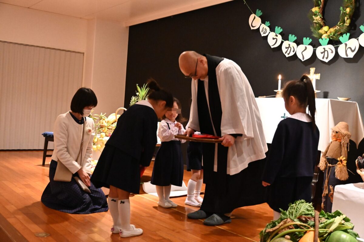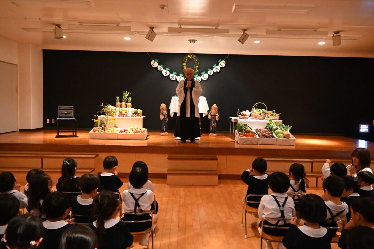 聖ミカエル教会の瀬山 会治司祭様にお越しいただき、迎えた本日の収穫感謝礼拝。みんなのお家から持ってきて頂いた野菜や果物を祭壇にお飾りし、秋の実りに感謝して祈りの時をもつことができました。