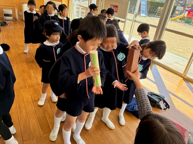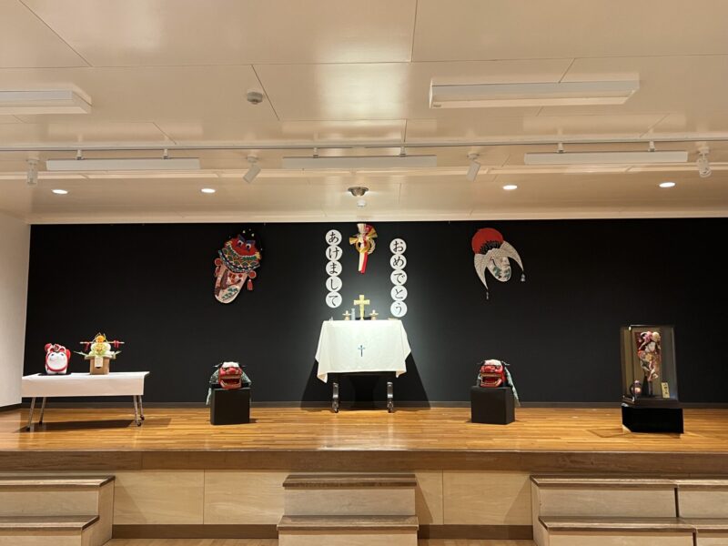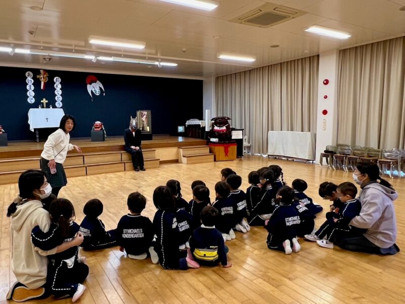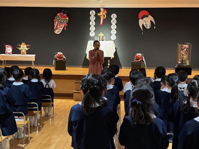 3学期、ホールでお礼拝からのスタートでした。大門には松飾り(これは武川先生が活けてくださいました)ホールには凧.鏡餅.獅子舞.羽子板などが飾られており、園長先生の『日本の良き伝統・文化を子どもたちに知って欲しい』という思いから今も続いています。(凧は卒園児のおじ様の手作りで、とても繊細な模様と色彩です)