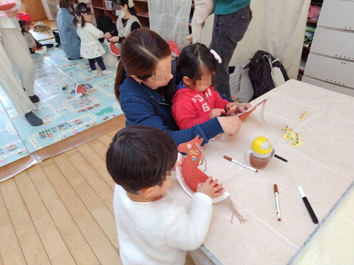 お部屋に戻っておやつを頂いたあとは、今年の干支「午年」にちなんで【ゆらゆらお馬さん】を作りました♪絵の具を塗ったり、毛糸を貼ったり、とってもかわいく完成しましたよ♪おうちでも遊んで下さいね!