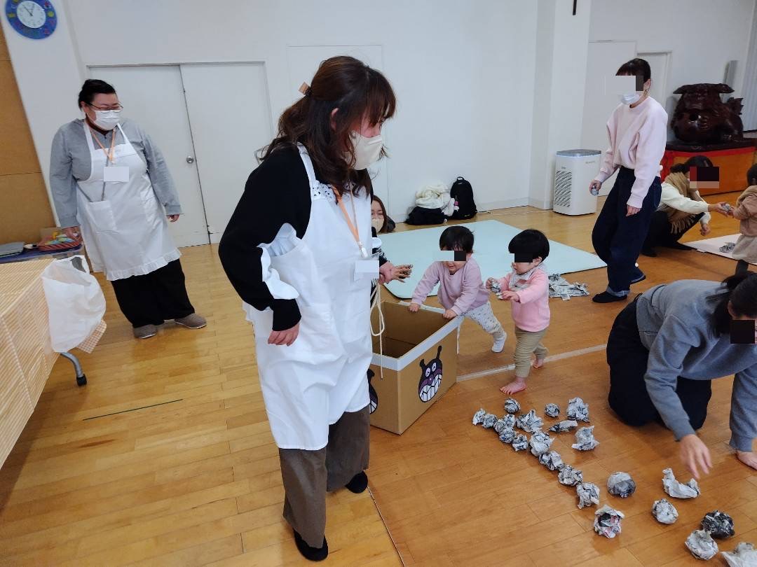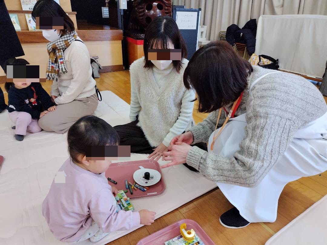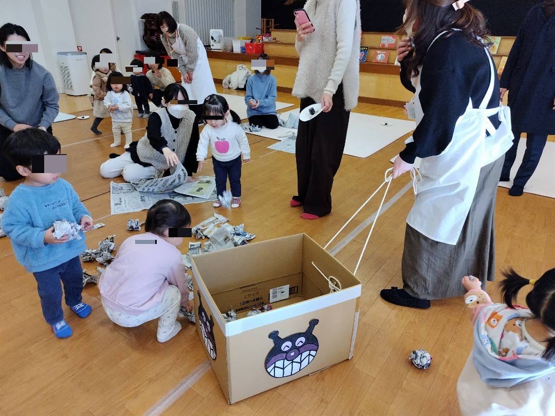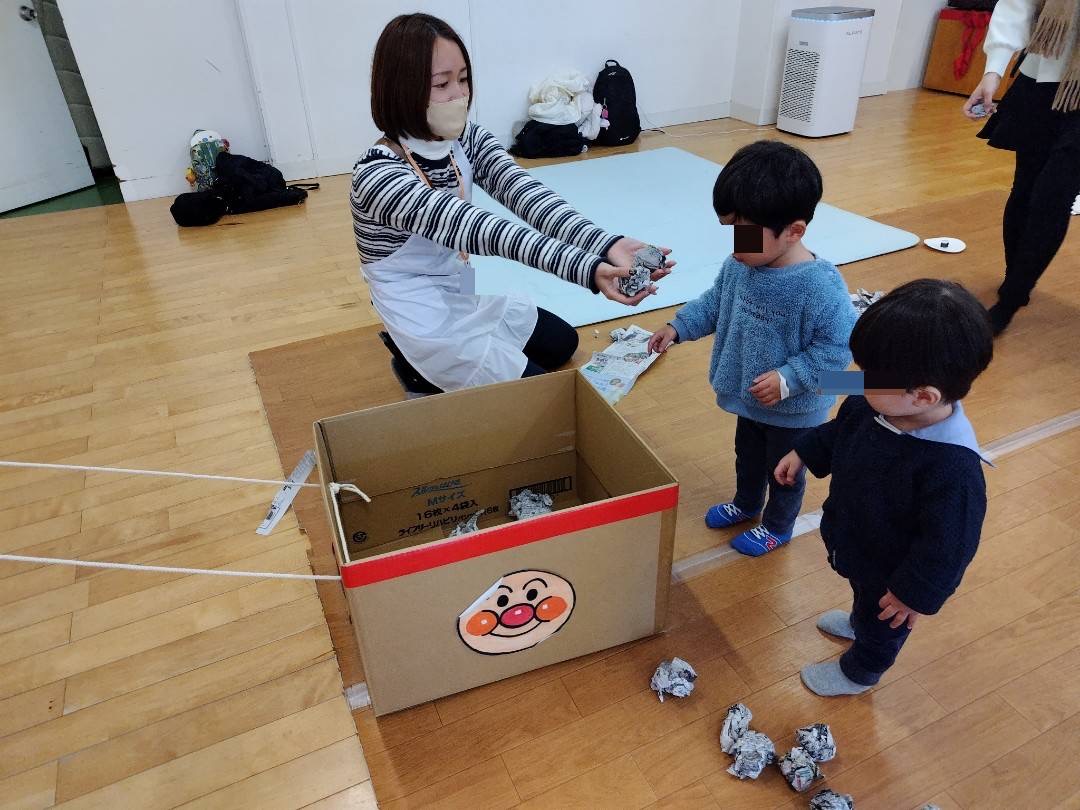 はじまりのお歌を歌って、お遊びタイムがスタート!お家の方と一緒に、絵本の読み聞かせや手遊び、“紙皿コマ”製作、新聞紙遊びなどを楽しみました。コマ製作では、クレパスでお絵描きしたり、シールを貼ったりして素敵に仕上がりましたね♪そのあとは“新聞紙遊びタイム”!新聞紙をビリビリに破ったり、破った新聞紙でボールをつくったり、アンパンマンやバイキンマン号に向かってのボール投げを楽しんだり…お友だちの元気な姿にほっこりしました♡皆でおやつもいただいてニッコリのお友だちでした!