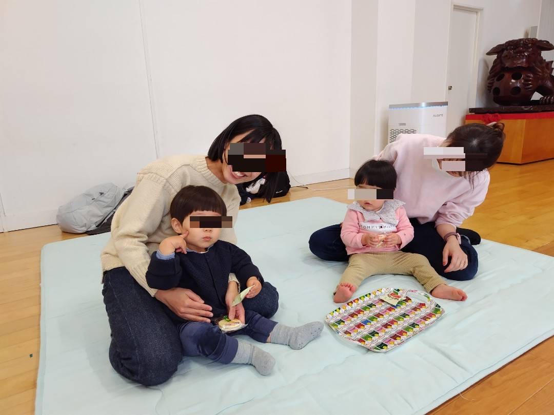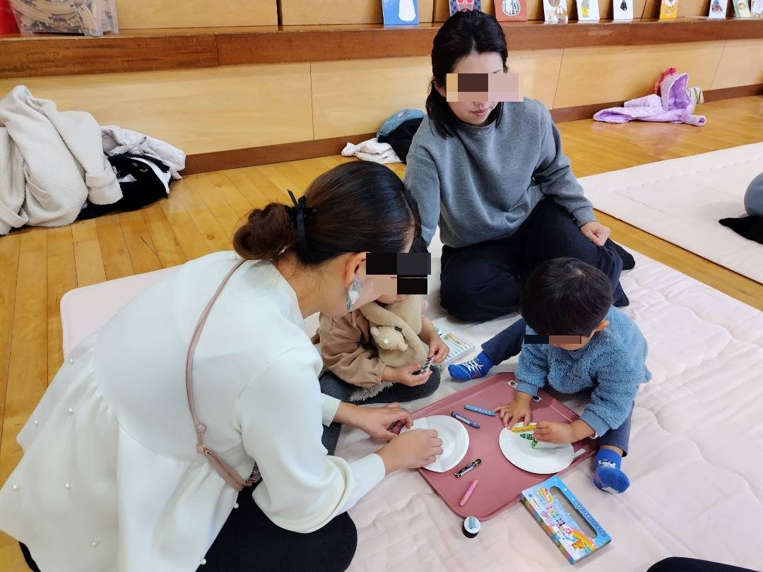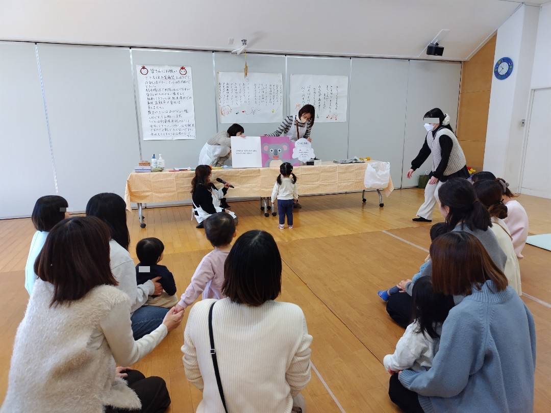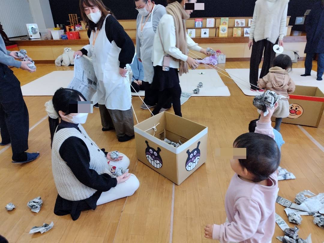 はじまりのお歌を歌って、お遊びタイムがスタート!お家の方と一緒に、絵本の読み聞かせや手遊び、“紙皿コマ”製作、新聞紙遊びなどを楽しみました。コマ製作では、クレパスでお絵描きしたり、シールを貼ったりして素敵に仕上がりましたね♪そのあとは“新聞紙遊びタイム”!新聞紙をビリビリに破ったり、破った新聞紙でボールをつくったり、アンパンマンやバイキンマン号に向かってのボール投げを楽しんだり…お友だちの元気な姿にほっこりしました♡皆でおやつもいただいてニッコリのお友だちでした!
