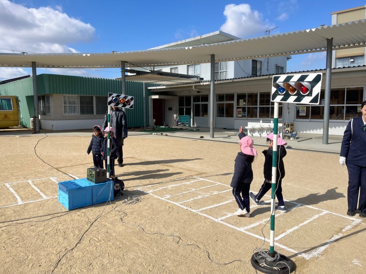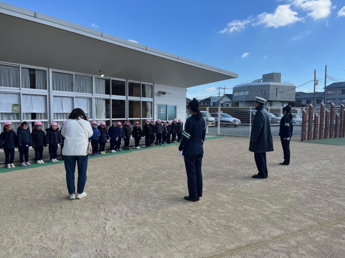 その後、年長組は園庭で実際に信号機を使用し、教えてもらったことを思い出しながら、みんなで横断歩道を渡る練習をさせて頂きました。4月から小学生になる年長組さん、緊張感をもって真剣に取り組みました。今日教えていただいたことを忘れず、またお家の方とも小学校まで行く練習をしてみてくださいね。